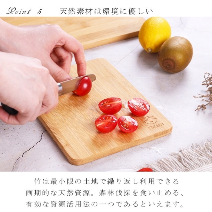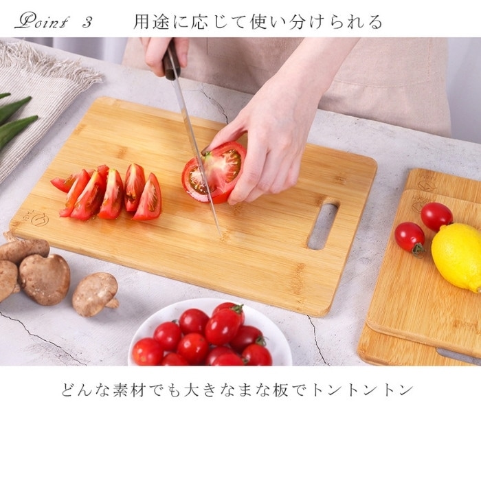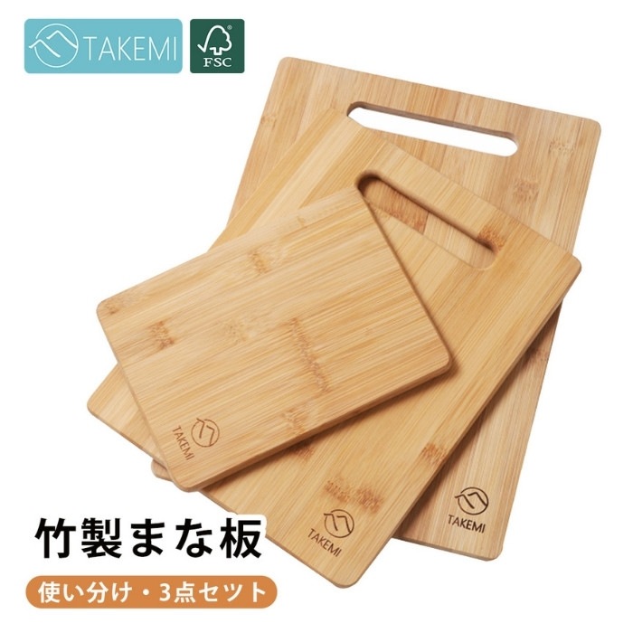 天然素材のぬくもりと美しさを! TAKEMI(竹美)の竹製まな板3点セット! 豪華なご馳走を準備するにも便利だし、“ちょこっと”使いにもちょうどいい! お引越し祝いなどにおすすめのプレゼントです! どんな素材でも大きなまな板でトントントン、 小さなまな板は切ってそのままサービングボードとして食卓へ、小さくて軽いのでサッと気軽に使えます。竹製はとても軽量なので、どこでも使えてアウトドアでも大活躍できます。 【TAKEMI竹のまな板の嬉しい 5つのポイント】 よく見かけるカッティングボードは木製が多いと思いますが、竹製のカッティングボードにはたくさんのメリットがあります。 1.天然の抗菌・防臭効果 竹に優れた抗菌・防臭効果があり、食材のニオイ移りも防ぎます。食品に対しても安全な素材で、バクテリアの繁殖を抑えると言われています。 2.乾きやすい 水切れが良く、乾きが早いので黒カビも発生しにくい 3.傷みにくく、長持ちする 適度な硬さがあって、刃当たりがとてもスムーズで、素材を切りやすく包丁との相性も良くなっています。 4.安全・安心 原材料、製造、加工の全ての段階で、有害な化学薬品、添加物は一切使用しておりません。直接口に入る物に触れますので、薬品や塗料を使用せず食用大豆油で仕上げてあります。 5.環境にも優しい 竹は最小限の土地で繰り返し利用できる画期的な天然資源。環境問題・温暖化問題の一因である森林伐採を食い止める、有効な資源活用法の一つであるといえます。 【用途いろいろ】 竹素材感が食材の色味を引き立ててくれるので薬味などの野菜を乗せて器としてお使いいただけます。パンやチーズなどを乗せてそのまま食卓に出せたりいろいろな用途でご使用いただけます。 【お手入れ方法】 ★表面の色が薄くなってきたら、キッチンペーパーか薄手のふきんなどに少量のオリーブオイルをしみこませ、まな板の表面を拭く。これで色がよみがえります。 【使用上の注意】 1.長時間水につけたり放置したりせず、こまめに洗って下さい。 2.洗った後は良く水を切り、直射日光の当たらない風通りの良い場所に置いて下さい。 3.急な乾燥や熱で割れたり反ったりする可能性がありますので食器乾燥機は使用しないで下さい。 4.漂白剤は変色の恐れがありますので極力お避け下さい。 5.金属製のたわしなどを使用すると、竹の繊維がささくれてしまうことがありますのでご注意下さい。