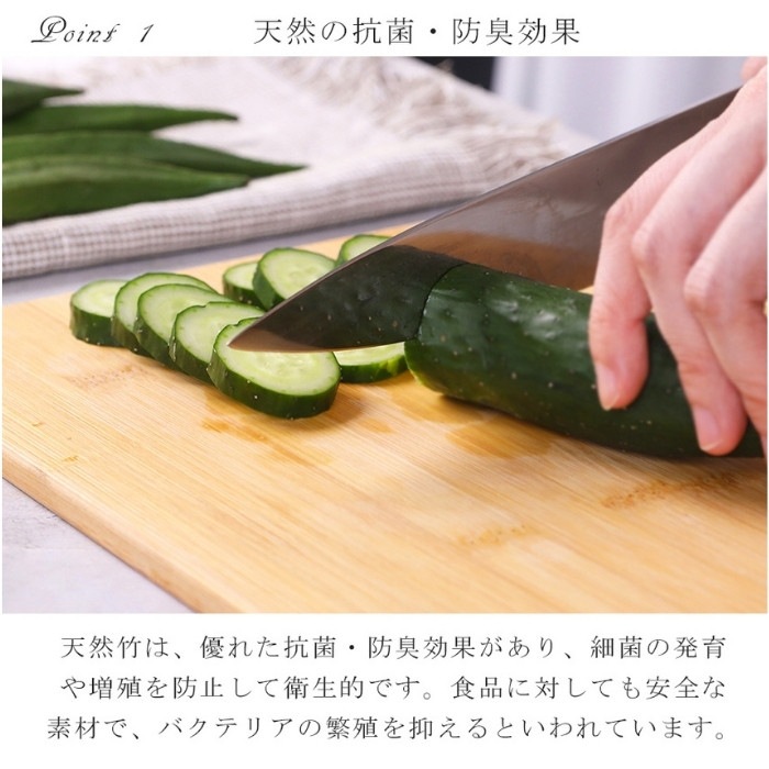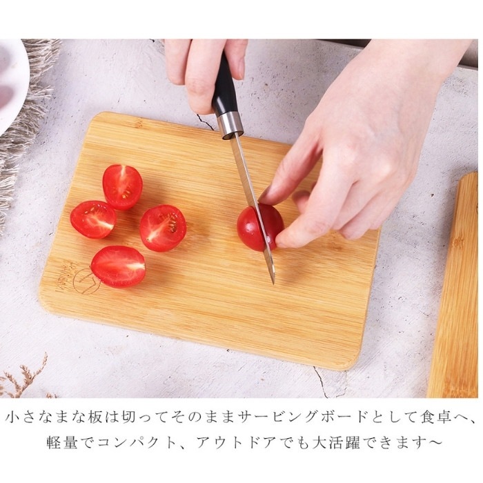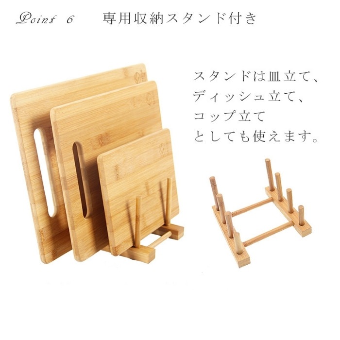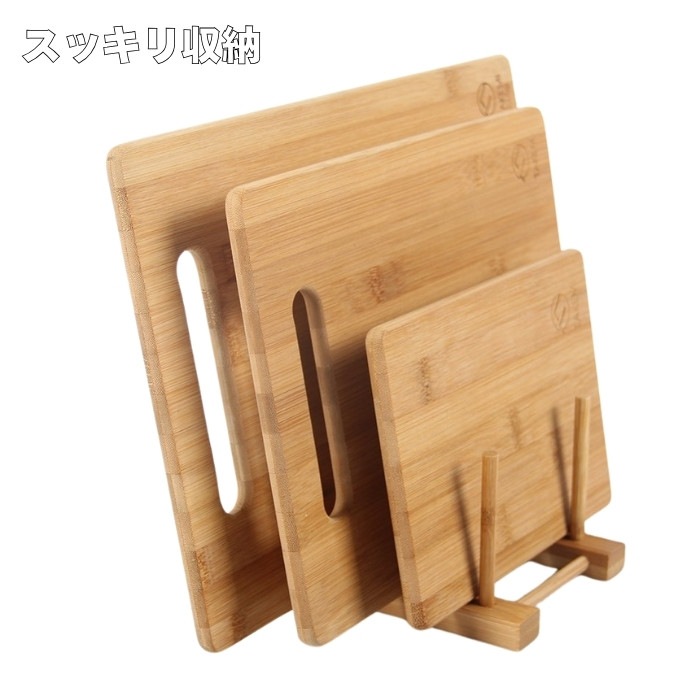 サイズ(cm):まな板3点:大33*24.1*1 /中28*21.6*1 /小20.3*15.2*1 &収納スタンド1点:14×12×10 材質:天然竹(大豆油コーティング) まな板は直接口に入る物に触れますので、薬品や塗料を使用せず大豆油で仕上げてあります。 モニターの発色の具合によって実際のものと色が異なる場合がございます。