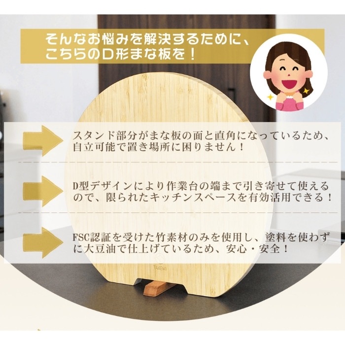 丸いまな板、自立するスタンド付き!立てて乾かせるので衛生的。置き場所に困りません。 \ 2024年11月 防カビ仕様にリニューアルしました / 防カビ加工を改良した商品をお届けいたします。 D型/半月型のまな板は、作業台の際まで引き寄せて使えるのでスペース広々。 料理が楽しくなるキッチンアイテム!抗菌・防臭に優れた竹製で野菜や果物、肉、魚等食材のカットがしやすい♪ おしゃれな丸まな板は家族にも喜ばれます♪
