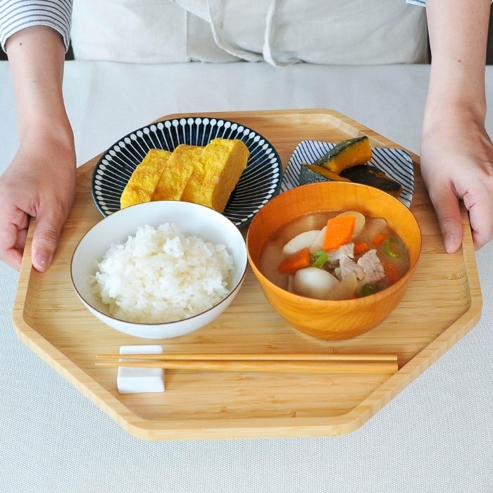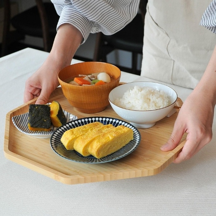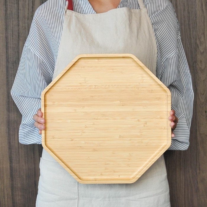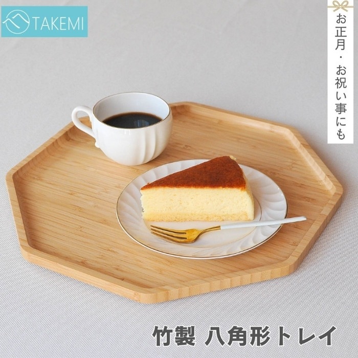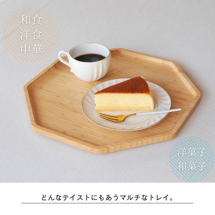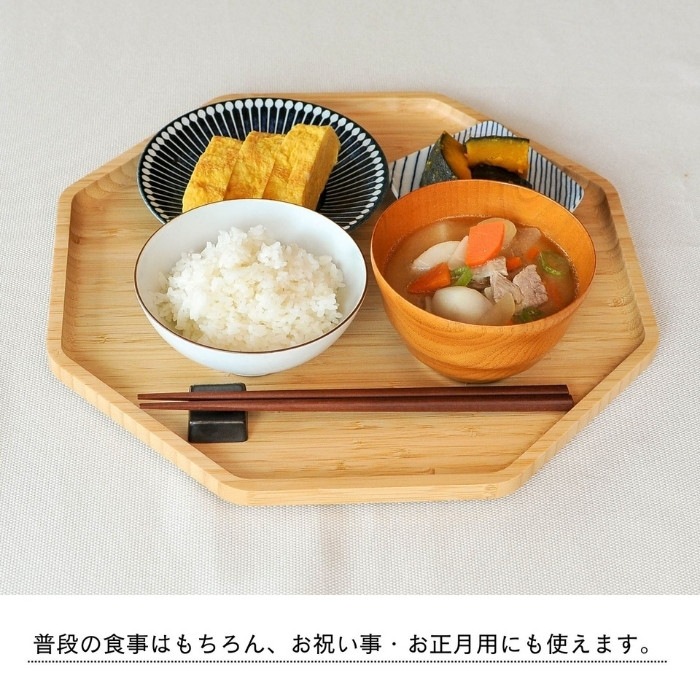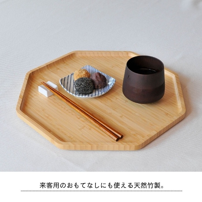 おしゃれでシックなデザインの竹製八角形のトレイ♪ お盆として普段使いもちろん、お祝いの料理が映える八角形のトレイは様々なシーンでお使いいただけます。 和食器も洋食器も合うナチュラルなデザイン。来客用の特別なおぼんとしても1つあると便利です。 ・お正月には、小皿におせちをのせて… ・赤ちゃんのお食い初めに、鯛をのせて… ・ひな祭りや端午の節句のお祝いに、ちらし寿司や柏餅をのせて… などなど、様々なお祝い事にも使える八角トレイ。 可愛くおしゃれな形なので、カフェトレイとしてもピッタリです。