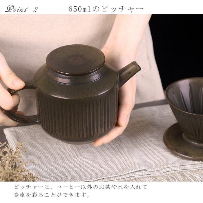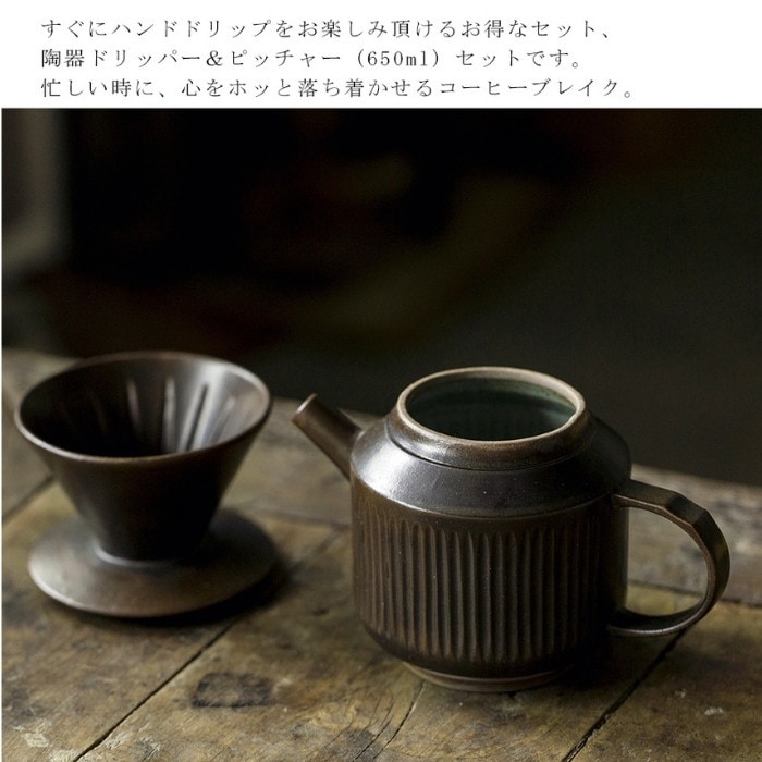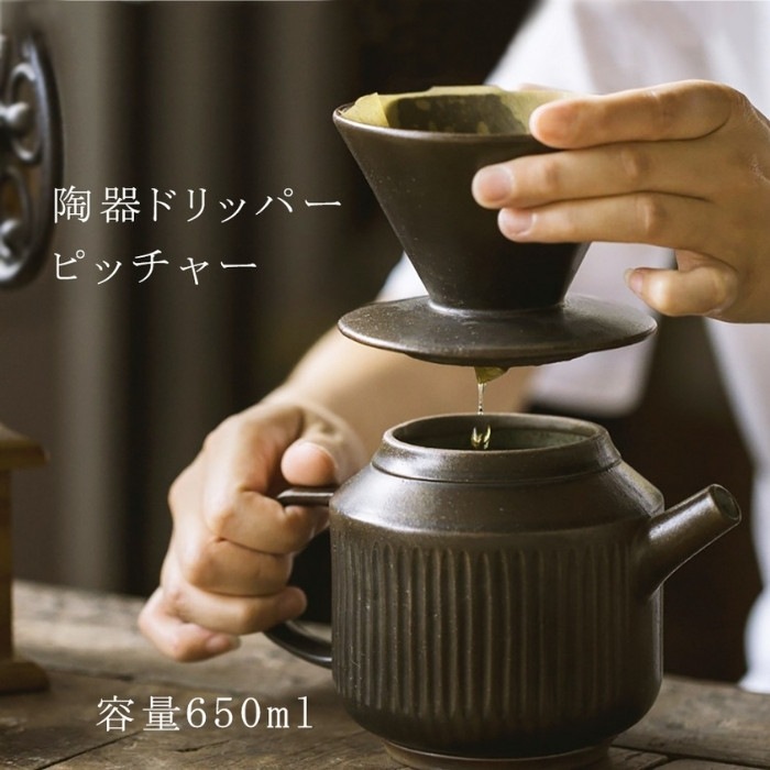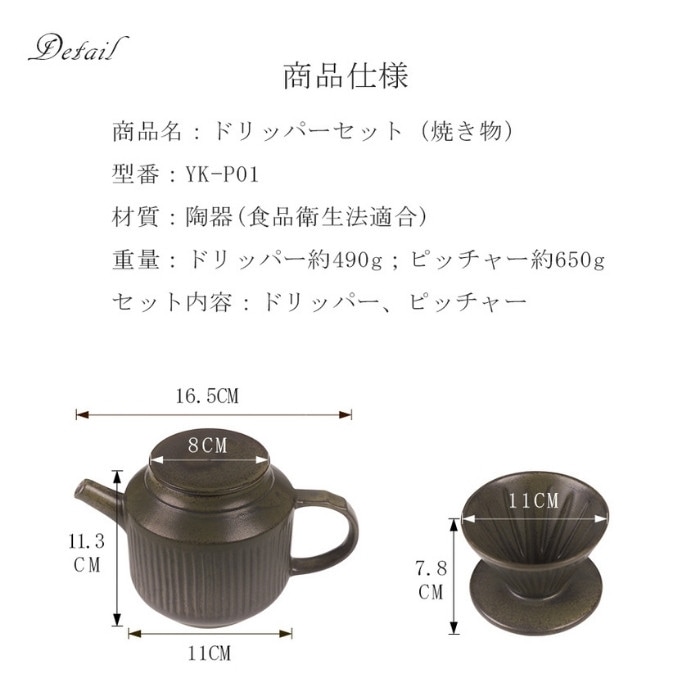 サイズ:(ピッチャー)約16.5*11.1*11.3cm、容量650ml; (ドリッパー)約φ10.8*7.9cm 材質:陶器(食品衛生法適合) 重量:ドリッパー約490g:ピッチャー約650g セット内容:ドリッパー、ピッチャー ※食洗機使用不可