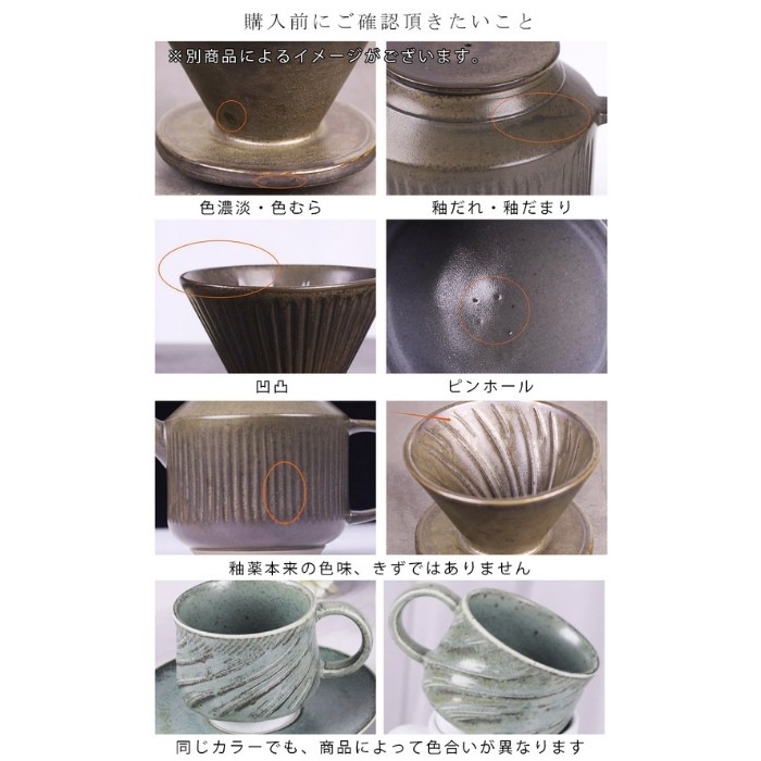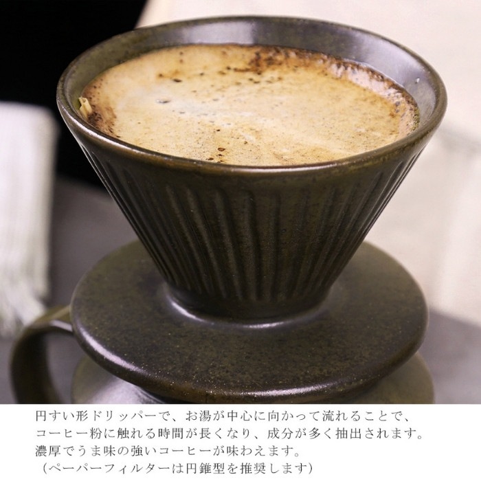 天然素材のぬくもりと美しさを! 良木工房YOSHIKIの陶製ドリッパーセット! 天然素材の風合いと色合いをお楽しみいただけます。 忙しい時に、心をホッと落ち着かせるコーヒーブレイク。 心を落ち着かせるために「コーヒーを淹れる。」 まさに至福の時間。 ゆっくりコーヒーを楽しむためのアイテム。 すぐにハンドドリップをお楽しみ頂けるお得なセットです! ◆円すい形ドリッパーで、お湯が中心に向かって流れることで、コーヒー粉に触れる時間が長くなり、成分が多く抽出されます。 濃厚でうま味の強いコーヒーが味わえます。(ペーパーフィルターは円錐型を推奨します) 陶器ならではの質感 ◆一つひとつ丁寧に作られている器は、独自の風合いあり、一期一会が魅力。使わないときも飾って置きたくなります。 ◆焼き物の温かみある風合いとして、一つひとつ表情の違いをお楽しみください。 用途 コーヒー 珈琲 ハンドドリップ カフェ 喫茶店 おうちカフェ ティー 紅茶 お茶 中国茶 日本茶 ティータイム おもてなし 来客用 自宅用 普段使い キッチン 大切な人へのプレゼント・贈り物にもおすすめ ご自宅用にはもちろんのこと、結婚祝いや引越祝い・新築祝いの贈り物にもおすすめ!来客時にも使える、おしゃれで実用的なプレゼントはきっと喜ばれます。 お手入れ方法 ▼使用する前にやわらかいスポンジなどで洗ってください。 ▼本製品の材質・製造工程上、表面に多少の色むらや釉垂れ、小さな穴、黒い点などがみられる場合がありますが、使用上問題はありません。 ▼焼き物ですので、お取り扱いには充分気をつけてください。強い衝撃や急激な温度変化により割れたり欠けたりする場合があります。 ▼スチールたわしや研磨剤入りスポンジを使用しないでください。本体に傷をつけ、破損の原因になります。 ▼使用後は食器用洗剤で洗って、乾かしてから収納してください。 購入前にご確認頂きたいこと ※ディスプレイの都合上、実際の色味と異なる場合がございます。 ※製造上の特性により、サイズや形状が各々多少異なります。 ※商品の特性上、多少の擦り傷やガタつきが生じる場合がございます。 ※製造時期(ロット違い)によっては、商品の色に多少の違いがある場合があります。 ※釉薬の色ムラや艶・斑点など、各々風合いにばらつきがございます。また、表面に焦げたような模様が見られる場合がございますが、これは焼成時に起こる陶磁器特有の窯変とよばれる現象です。 商品の特性上、お客様のご都合での返品・交換は一切受け付けておりませんので、予めご了承ください。