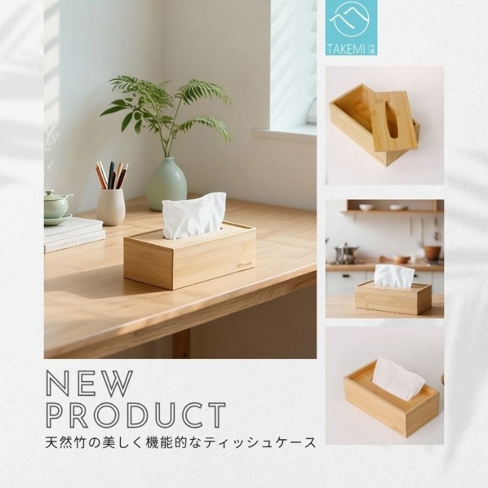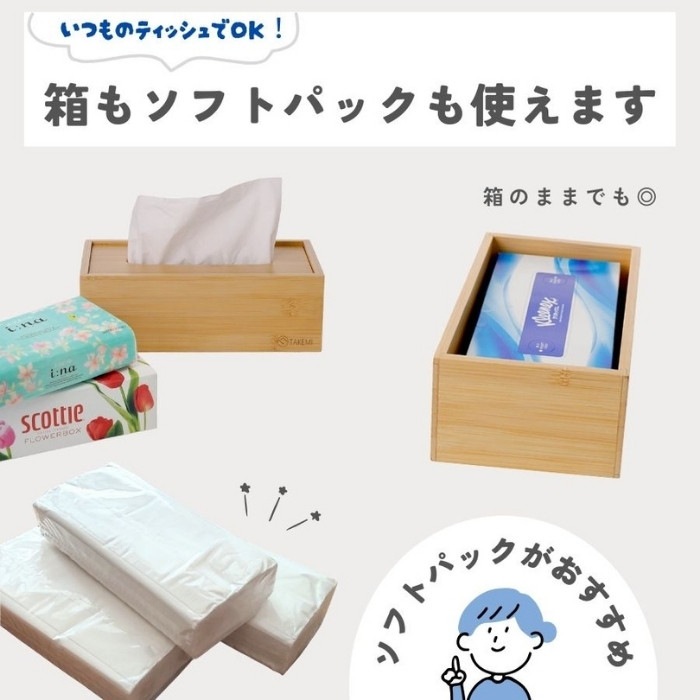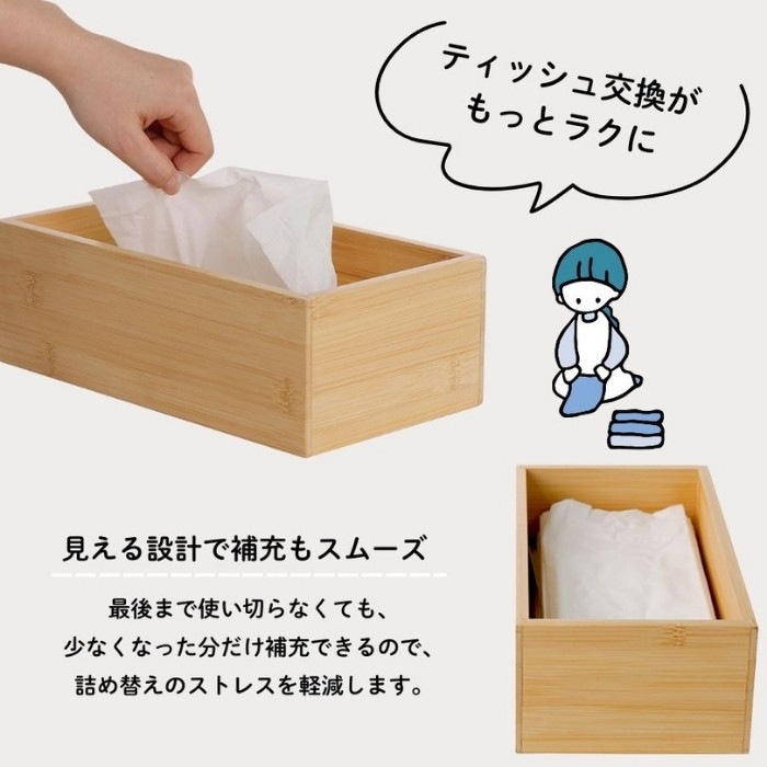 ・天然竹を使用した、あたたかみのある風合いのティッシュケース。お部屋にすっと馴染むナチュラルデザインです。 ・フタを軽く持ち上げるだけで、ティッシュの補充が簡単にできます。毎日使うものだからこそ、手間のかからないシンプルな構造に仕上げました。 ・ソフトパックティッシュをセットした場合、ティッシュの減りに合わせてフタが自然に下がり、残量が見やすくなります。 ※箱入りティッシュをそのまま入れた場合は、本機能はご使用いただけません。 ・ 環境に配慮したFSC認証の竹材を使用。暮らしの中で無理なくサステナブルな選択ができます。