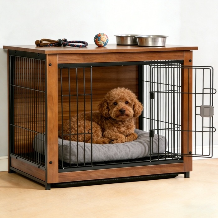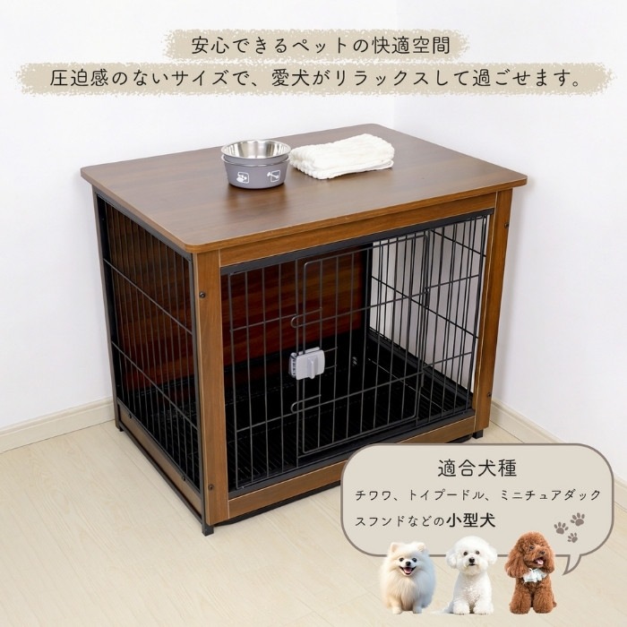 愛犬の日常のトイレトレーニングやハウストレーニングをサポートする、便利で安心なペットケージです。 留守番中や作業中など、ワンちゃんをケージ内で安全に過ごさせることができます。 圧迫感を与えにくい設計で、愛犬が安心してくつろげる快適な空間を提供します。 高品質な素材を使用し、しっかりとした構造で耐久性に優れています。 スライド式ロックを採用し、愛犬のいたずらによる扉の開閉を防止。 留守番時も安心してお使いいただけます。 また、上部は平らな天板仕様で、おもちゃやペット用品を置くスペースとしても活用可能。 お部屋の広さや愛犬のサイズに合わせて選べる【2サイズ・2カラー】をご用意しています。 こちらは、サイズ:S/色:ブラウンです。 大型荷物のため、離島配送料をいただく場合がございます。