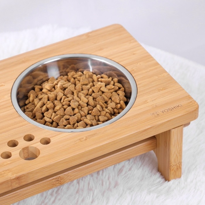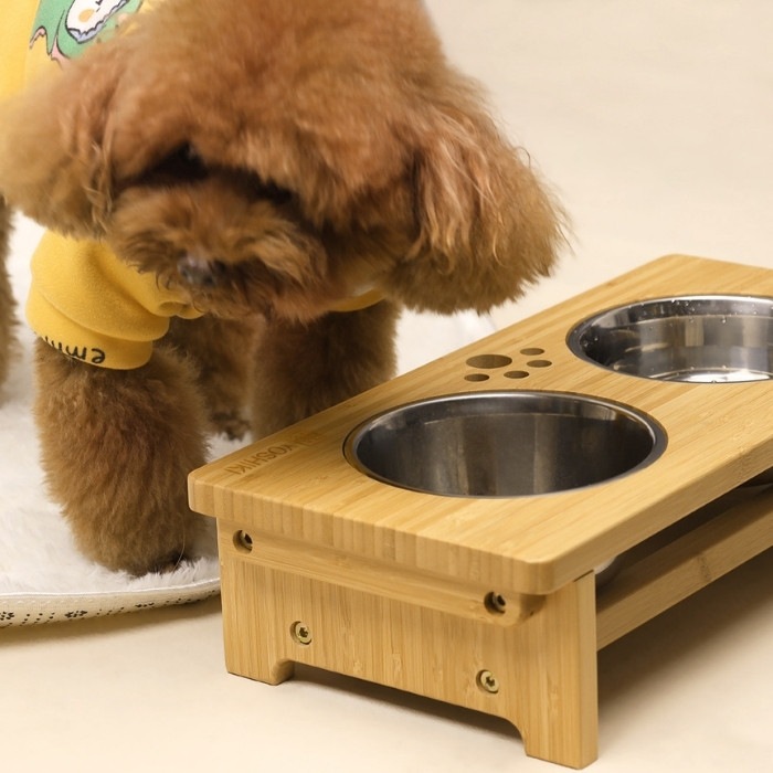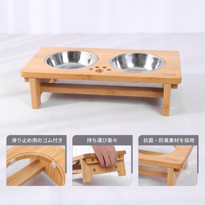 猫や小型犬が食べやすい竹製ペット食器台。 フードボウルが2皿セット!水とペットフードが入れられる餌台です。お皿が2個あるので、多頭飼いのペットの食事にも便利♪ 高さがあるので、シニア犬・シニア猫の体の負担が軽減して食べられる優しい設計です。 シンプルな形状だから食後はフードボウルをさっと取り外して簡単にお手入れができ、お皿も洗いやすいです。 食べこぼしがついても拭き取りやすいから衛生的でお部屋にも馴染むおしゃれな餌台です。 ※ボウル滑り止め用にゴムシール(G)を付属しております。ペットが誤飲する恐れがありますので、取り扱いには充分ご注意ください。