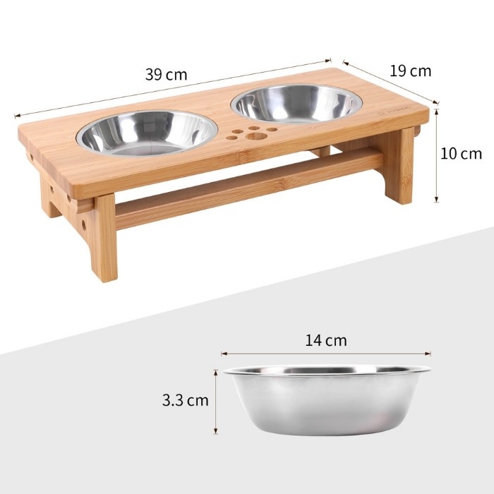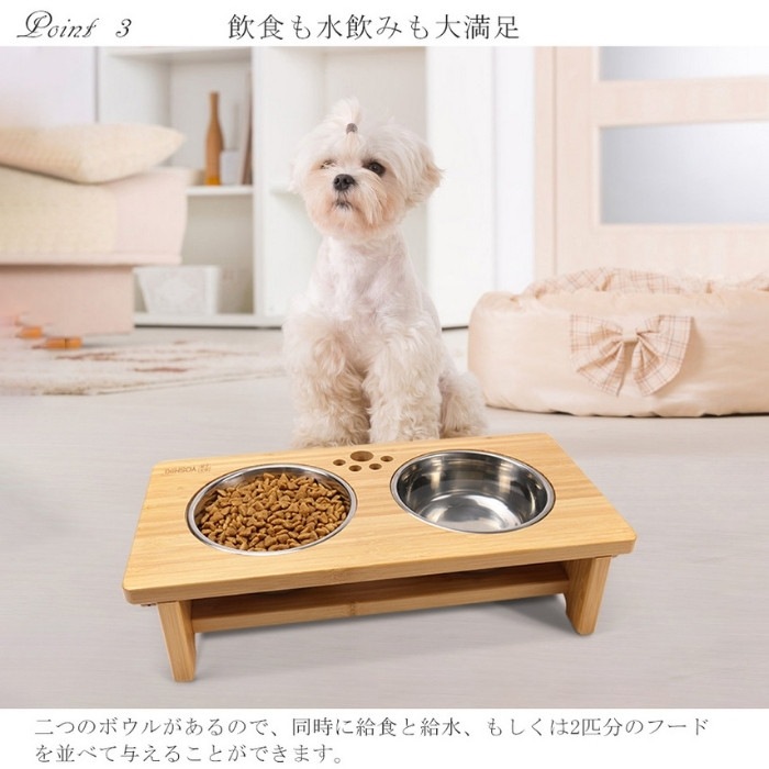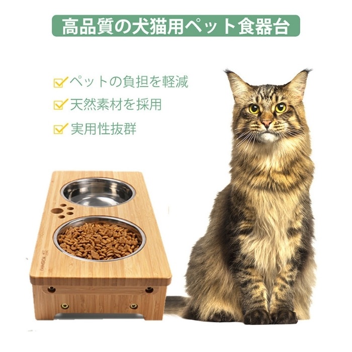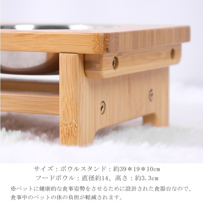 サイズ:ボウルスタンド:約39*19*10cm:フードボウル:直径約14、高さ:約3.3cm 重量:組立後約1.4kg 材質:スタンド本体(天然竹、透明ラッカー塗装)、フードボウル(ステンレス) セット内容:スタンド本体、フードボウル2個(組立説明書1式&組み立て用ネジなど付)