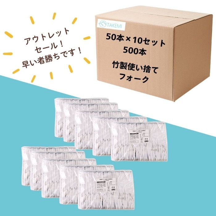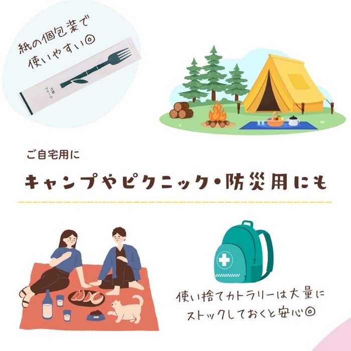 \大容量・個包装で衛生的!天然竹のエコフォーク/ 環境にやさしく衛生的に使える、竹製使い捨てフォーク500本セット。 1本ずつ個包装されているので、外出先でも清潔に持ち運び・保管できます。 キッチンカーやテイクアウト、デリバリーなどの業務用用途におすすめ! また、キャンプやピクニック、バーベキューといったアウトドア、さらには防災用の備蓄アイテムとしても便利です。 大容量セットでコストパフォーマンスも抜群! 数量限定のアウトレット特価でご提供中です。