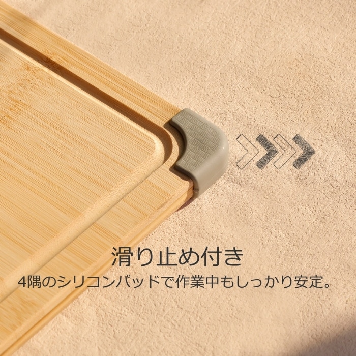 新登場!滑り止め&溝付き、使いやすさを極めた竹製まな板 ・滑り止め付きで安心 調理中にズレにくく、安全にご使用いただけます。 ・竹素材の抗菌・防臭効果 食材のニオイ移りを防ぎ、バクテリアの繁殖を抑えるといわれています。いつでも清潔に保てます。 ・水切れが良く、乾きが早い 黒カビが発生しにくく、肉や魚をカットしても色・臭いが残りにくい仕様です。 ・便利な溝付きデザイン 肉汁や果物の水分がこぼれにくく、テーブルを汚しません。ローストビーフやフルーツカットにも最適。 ・安全仕上げ 薬品や塗料は使わず、大豆油でナチュラルにコーティング。口に入る食材にも安心です。