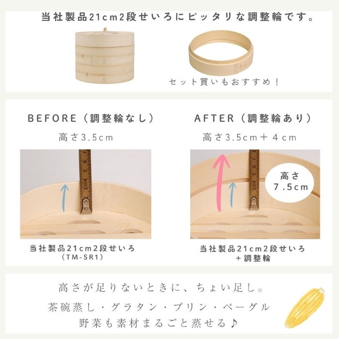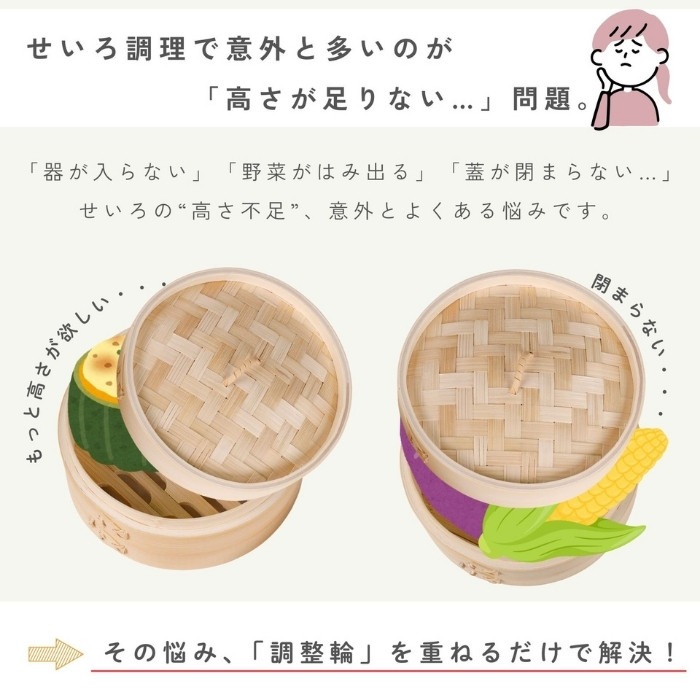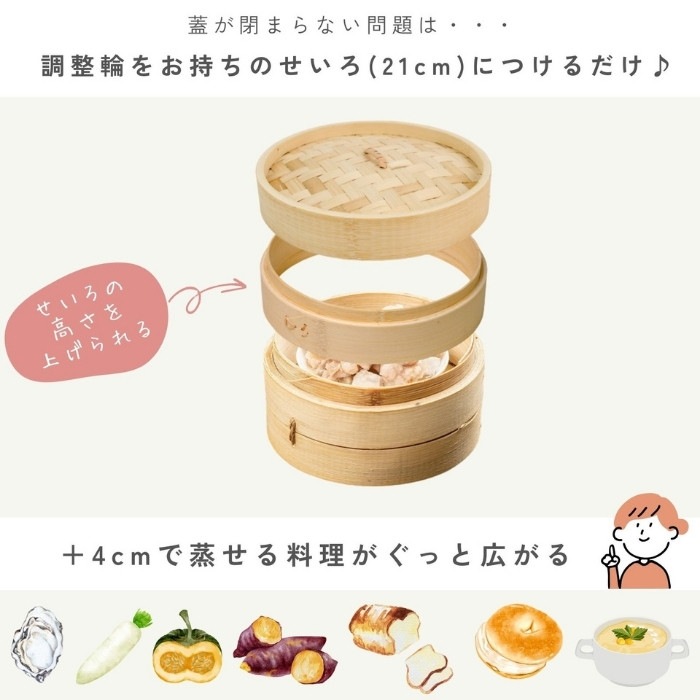 外径21cm蒸籠にぴったり合う調整輪。 浅型(深さ3.5cm)の蒸籠に重ねるだけで使いやすさUP。 ナチュラルな質感で安心。 既存のせいろに重ねるだけで蒸しスペースを確保。 点心、野菜、魚など多彩な料理に活躍。