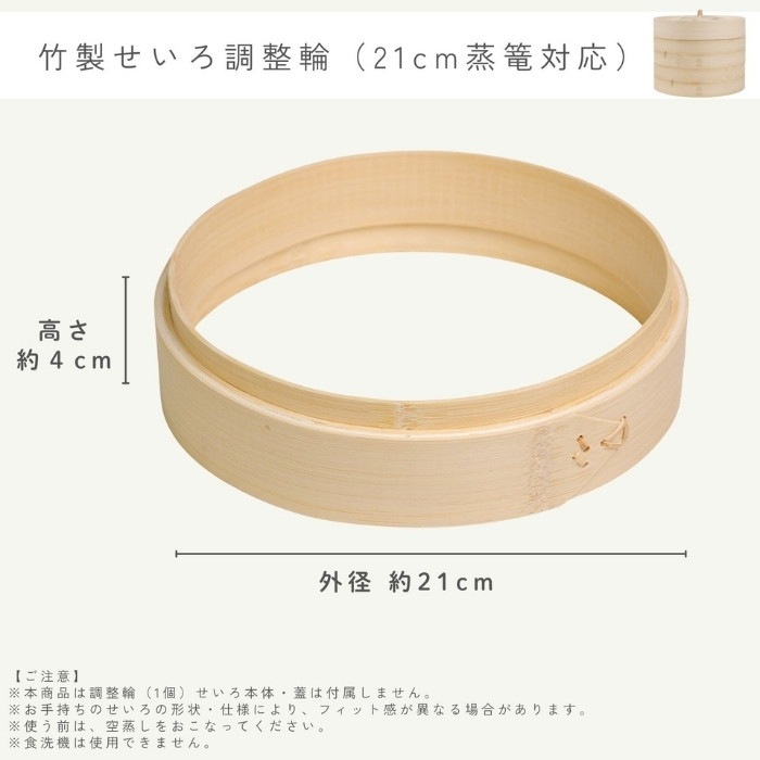 内容:調整輪1個 材質:天然竹 サイズ(約): 外径21×高さ5.2cm 【ご注意】 ※本商品は調整輪(1個)のみです。せいろ本体・蓋は付属しません。 ※お手持ちのせいろの形状・仕様により、フィット感が異なる場合があります ※食洗機対応しておりません。