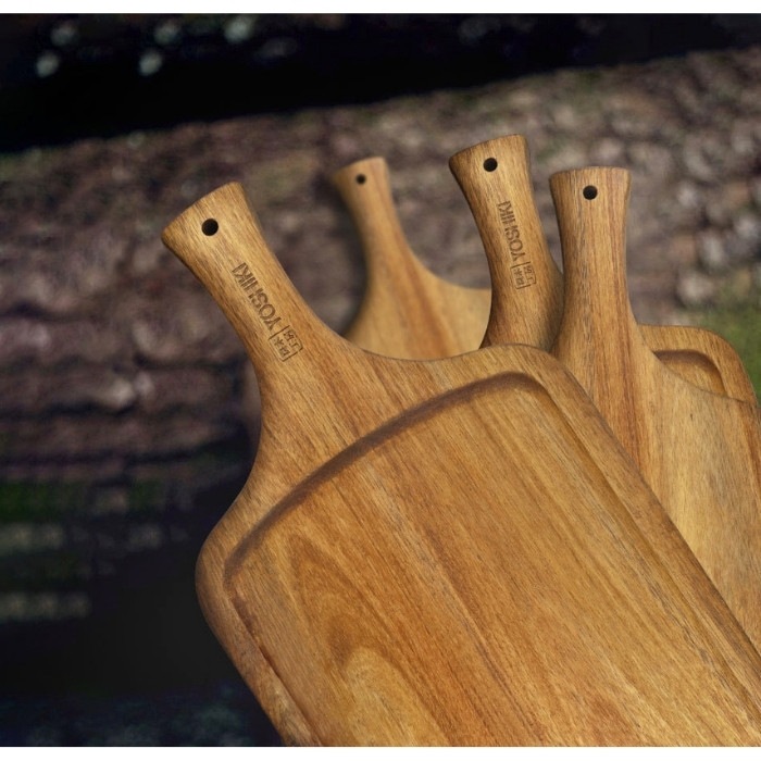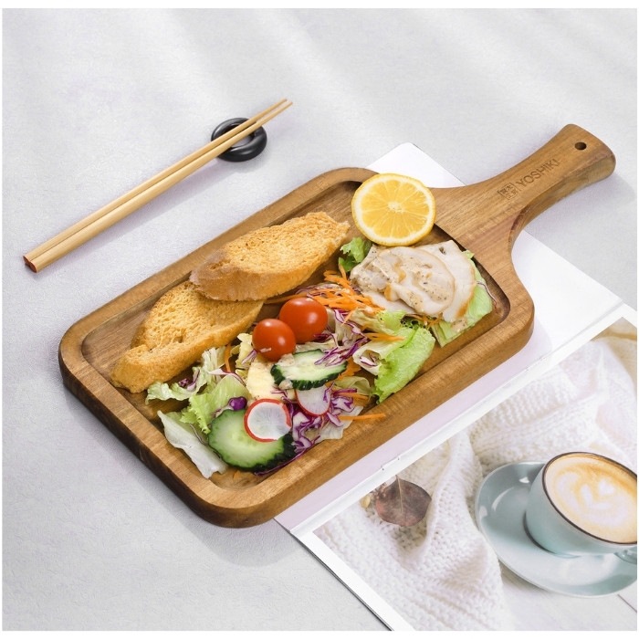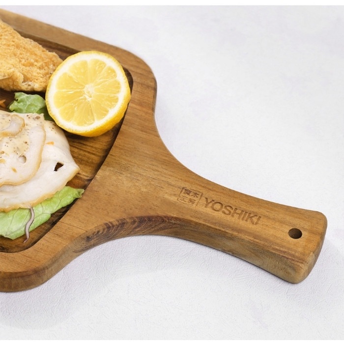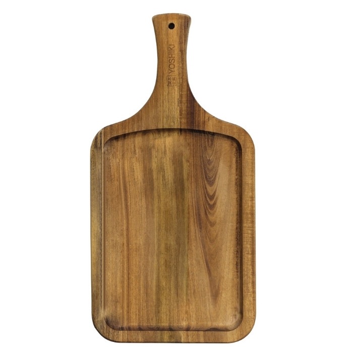 木製のカッティングボードは、お皿にもなるデザインで一枚2役の便利で使いやすいキッチンアイテム。 サラダやパンを盛りつければ、カフェのようなおしゃれな食卓に。 ナチュラルなデザインで来客時にも使いたいカッティングボードです。 アウトドアで大活躍。 取っ手に穴が開いているので、吊るすことができ収納にも便利。