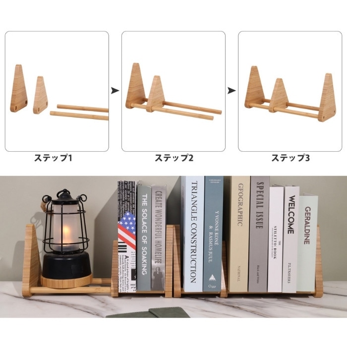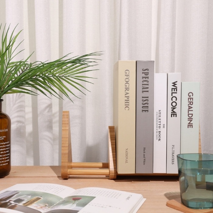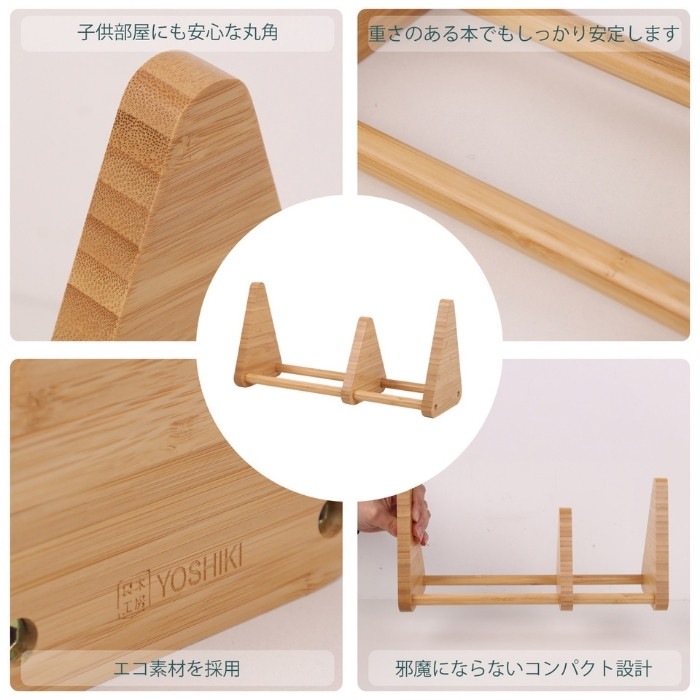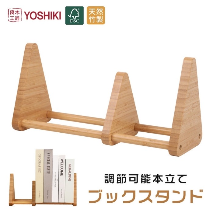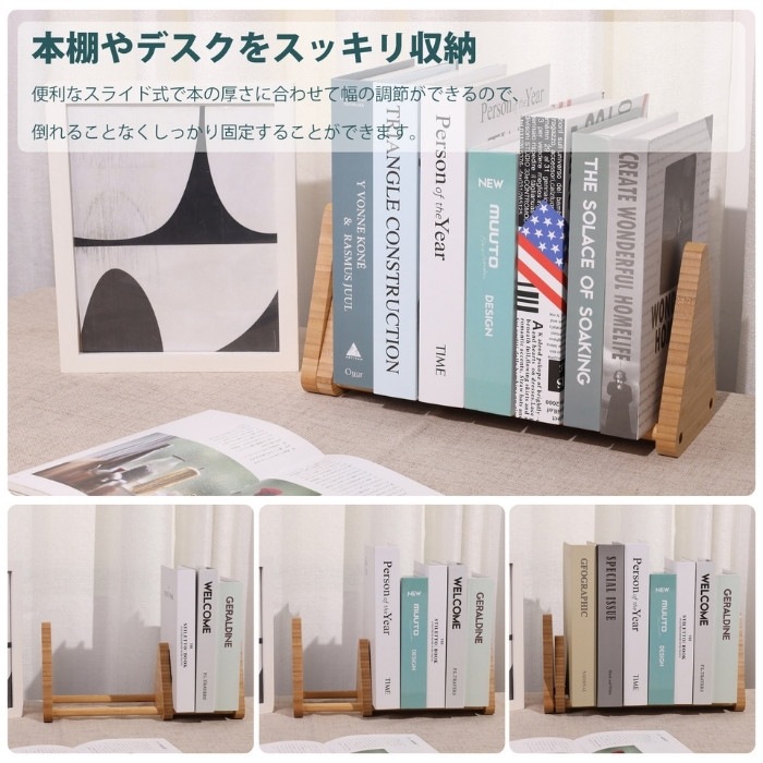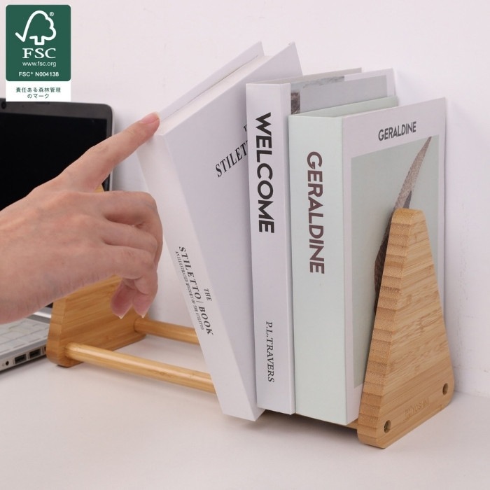 おしゃれな天然竹製卓上ブックエンド【FSC認証製品】 テーブルや棚の卓上に置けるちょうどよいサイズで倒れにくいブックスタンド。 リビングから子供部屋、書斎、寝室など場所を選ばないシンプルなデザインの本立て。オフィスの事務用品としても使いやすいブックエンドです。 可動式のブックスタンドなので、様々な本の厚さも調整可能です。 成長に合わせて絵本棚〜教科書や辞書を収納して自分だけの本棚に。 子供から大人まで長く使えるデザインのブックエンド。様々な用途でお使いいただけます。